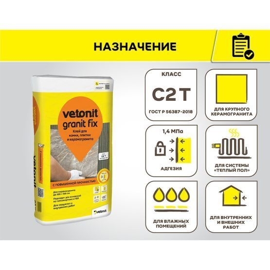 Vetonit granit fix - клей класса С2 Т подходит для внутренних и наружных работ, для стен и пола, включая систему «Теплый пол». Рекомендованный формат керамогранита – до 100х100 см.